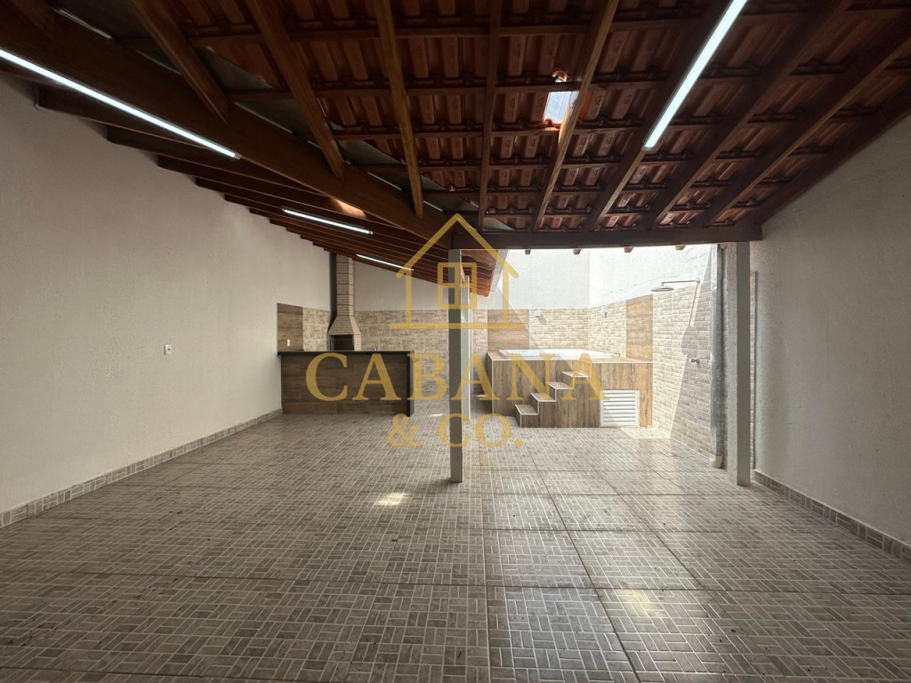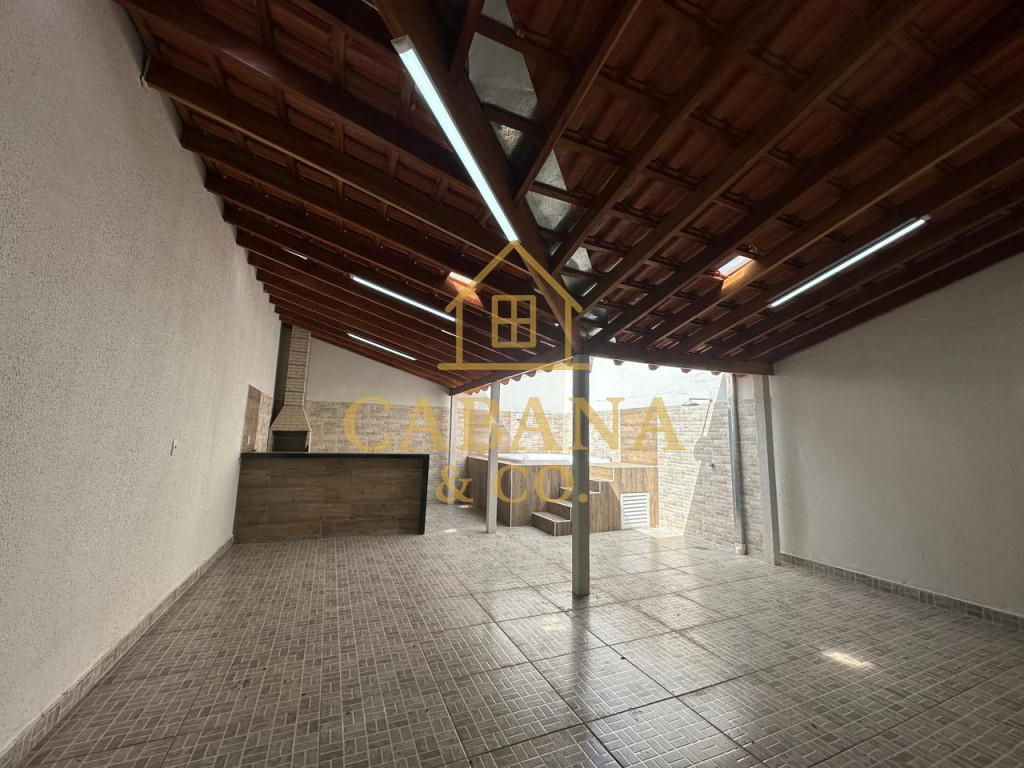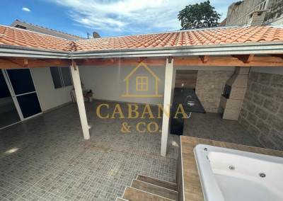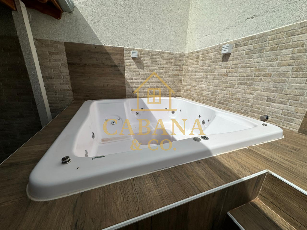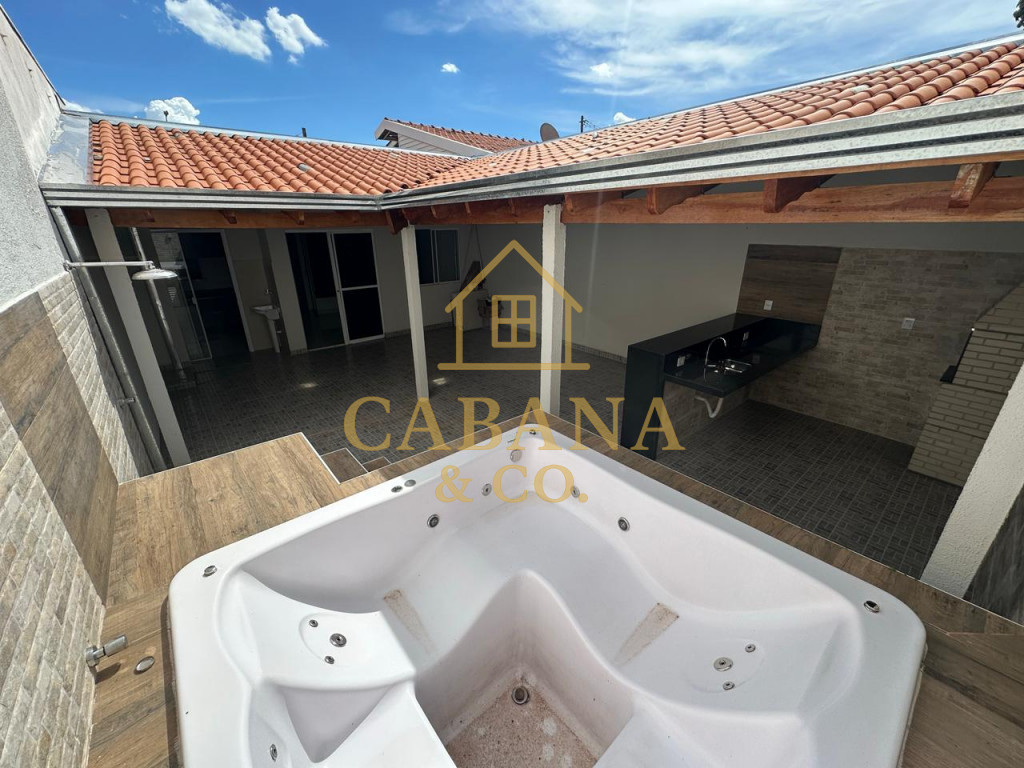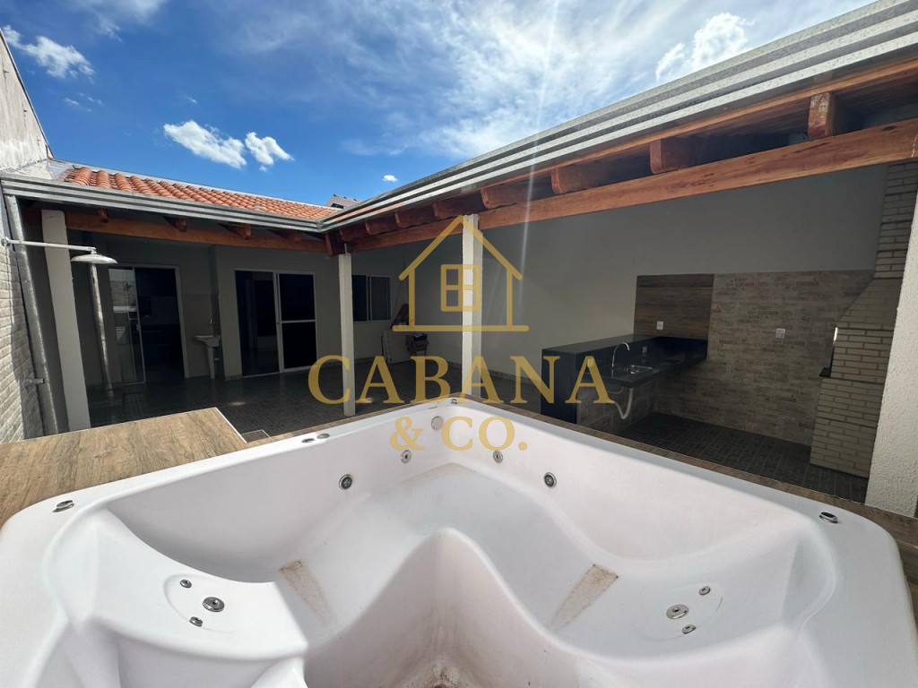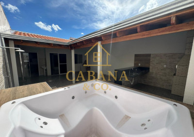 casa com jacuzzi aquecida, 2 dormitórios sendo 1 com armários planejados, ar condicionado, wc social com box, sala de estrar ampla com 2 ambientes, cozinha com armários, quintal no fundo com área gourmet com churrasqueira, e jacuzzi aquecida para 4 pessoas .